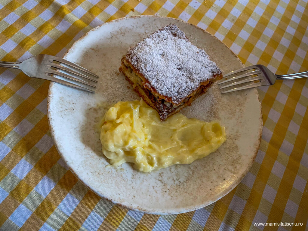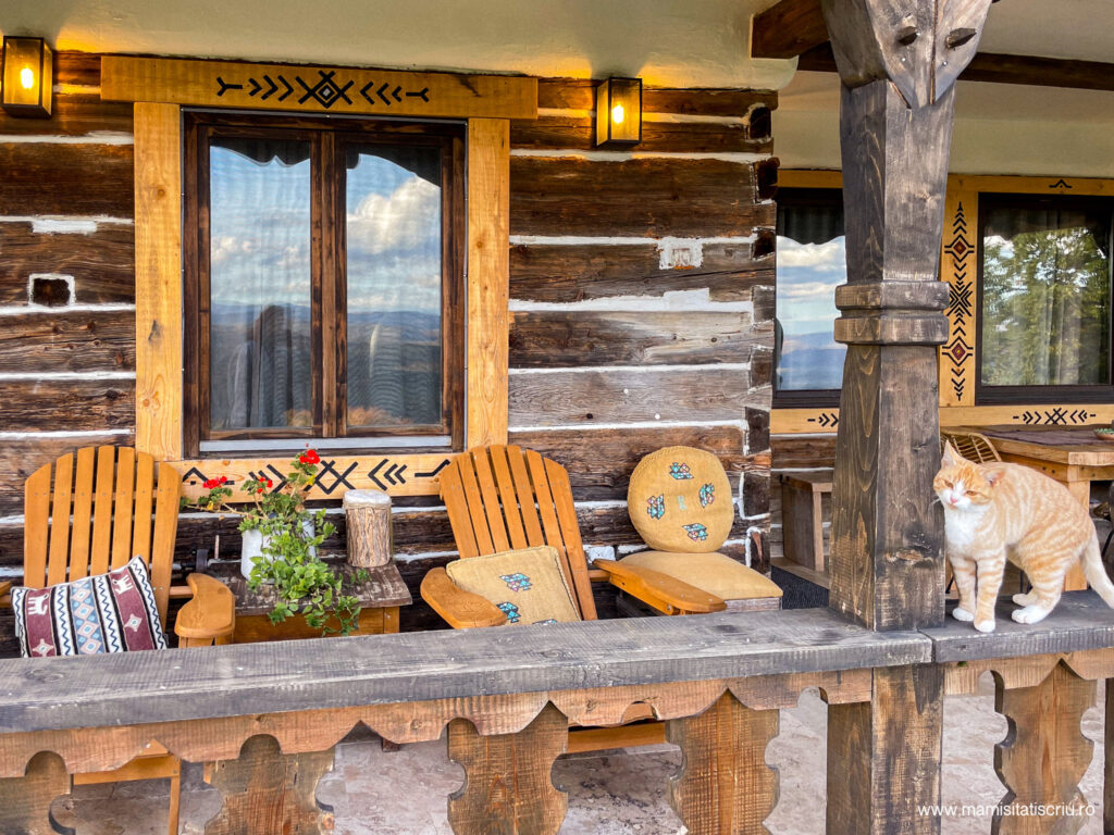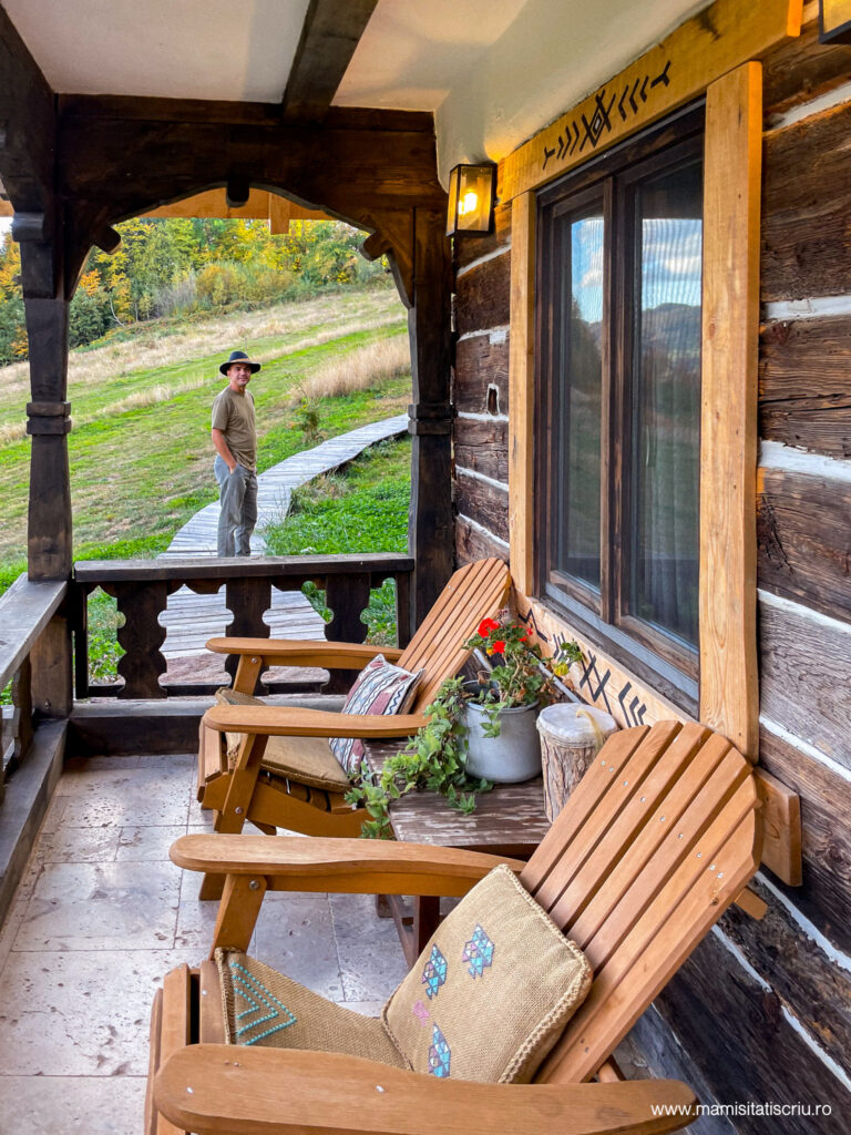 Pe prispa casei se afla o masa de lemn maricica pentru servit orice masa a zilei cu o priveliste de vis, dar si doua sezlonguri de lemn ceva mai intr-o parte, unde am stat zilnic doar pentru aer curat, relaxare, ascultat linistea naturii si savurat viata simpla de la granita dintre cer si pamant.