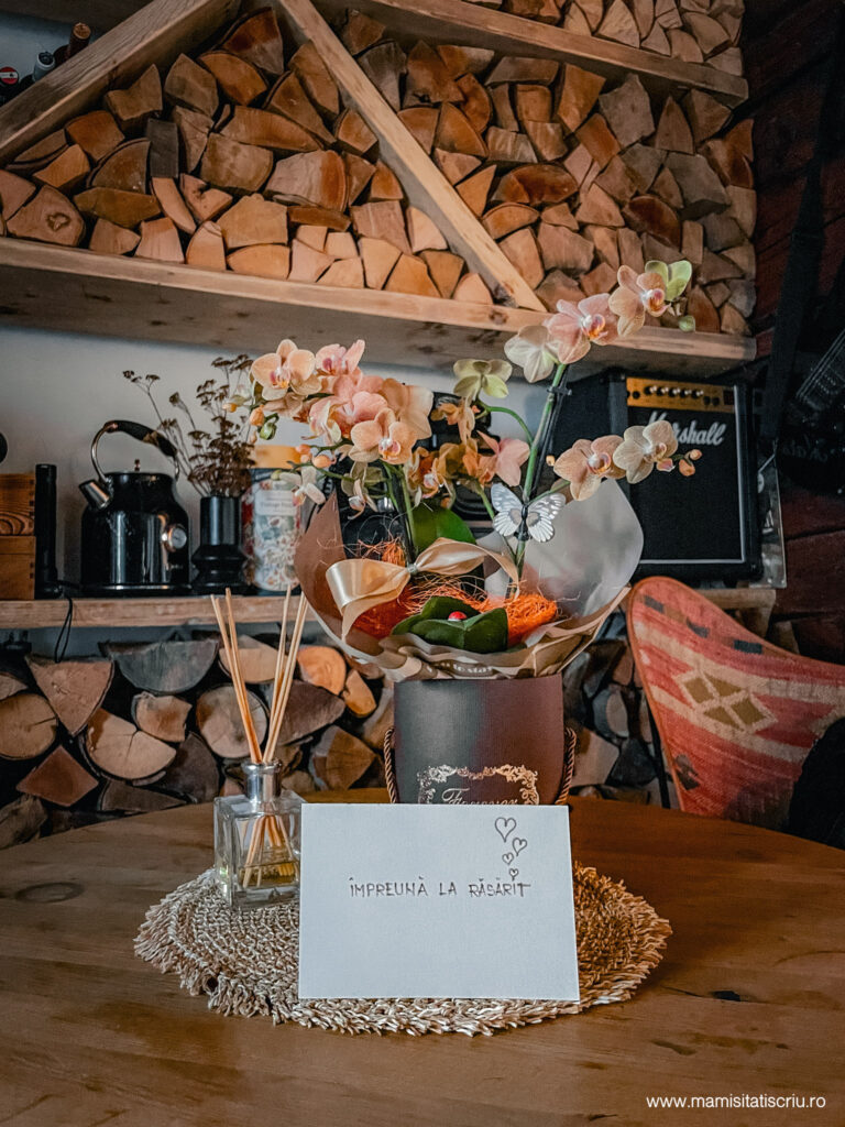 Un aer de rustic modern ne-a lovit in freza, in timp ce pe masa zacea un biletel cu un mesaj sub un buchet de flori. Era surpriza mea de la Alex.
