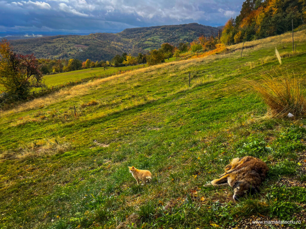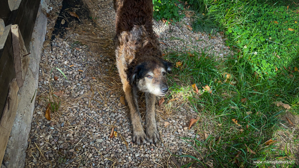 Vazandu-l asa, Alex s-a mobilizat rapid si a gasit o doamna veterinar in satul vecin, care a venit cu masina personala pana la cabana si i-a facut niste injectii ca sa il puna pe picioare. A reusit cumva, caci in ziua in care am plecat, catelul nostru batranel, ne-a condus pana sus in deal la masina, unde ne-am luat la revedere cu mangaieri si promisiuni aruncate-n Univers.
