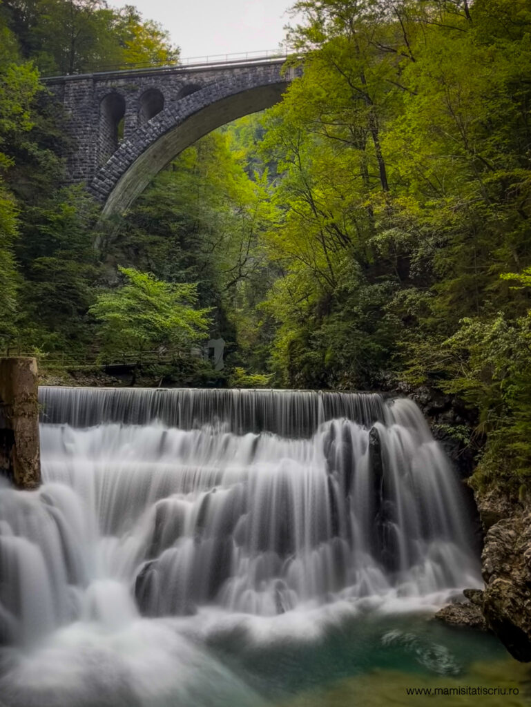 Ne-am plimbat agale, pana cand la un moment dat am ajuns in dreptul unui baraj si al unui pod din piatra in forma de arc, despre care am aflat ca este podul caii ferate Bohinj, care a fost construit in anul 1905 si care se afla la 33,5 metri deasupra cararii pe care noi am ajuns acolo.