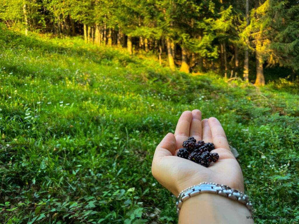 Ne-am intors pe alt drum catre parcarea microbuzelor, nu tot pe cel pe care am ajuns acolo si am gasit in calea noastra si ceva mure pe care le-am impartit negresit si le-am savurat cu pofta.